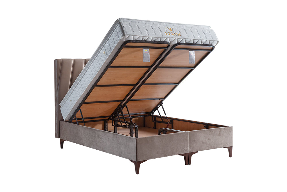 Sous le confortable couchage se cache un vaste espace de rangement, idéal pour ranger la literie, les oreillers ou les articles saisonniers. Grâce à son système de levage fluide, le compartiment s'ouvre et se ferme facilement : pratique et résistant à la fois.